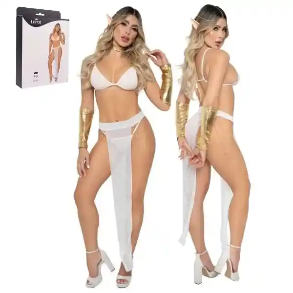 Disfraz de Elfa Lerot Transforma cualquier transmisión o evento en un cuento de fantasía con el Disfraz Elfa de Lerot, una combinación perfecta de sensualidad y magia. Su diseño en blanco y dorado resalta bajo la luz, ideal para llamar la atención en cámara y convertirte en la protagonista de tus propias historias. El panty tipo brasilera con tiras graduables y el brasier a juego realzan tu silueta, mientras que las orejas, la falda con cadenas y el accesorio de cabeza crean un look seductor y elegante, perfecto para juegos de rol, fiestas temáticas o shows webcam que buscan generar interacción y tips. Incluye: Accesorio de cabeza Collar Orejas Brasier Panty tipo brasilera Mangas Falda con cadenas Características del producto: Color: Blanco y dorado brillante Materiales: Lamé (75% poliéster, 20% lurex, 5% elastano) Mallatex (95% poliéster, 5% elastano) Herrajes metálicos, sesgo y tiras de brasier Ajuste: Tiras graduables para mayor comodidad y libertad de movimiento Textura suave, elástica y ligera para sesiones largas Ideal para: Shows webcam con temática de fantasía Fiestas de disfraces y juegos de rol sensuales Generar interacción y captar la atención de tus seguidores Envío: Para nosotros, el envío discreto es importante. Tu paquete se enviará en una caja marrón sencilla y la etiqueta de envío dirá simplemente «Atención al cliente» Confidencialidad: Tus pedidos se envían en una caja o sobre totalmente sellado y opaco sin ningún tipo de marcas externas. Para nosotros es muy importante tu privacidad. Despacho a todo Colombia