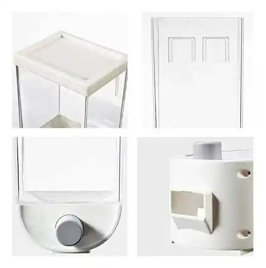 Dispensador de Cereales y granos con tapa, botón dosificador. Incluye adhesivo para pegar en la pared. Ficha Técnica Alto 25 cm Ancho 11,8 cm Profundidad 10,5 cm Capacidad 1,5 litros Funcionalidad: Permite almacenar y servir cereales, granos y snacks sin esfuerzo, manteniendo la frescura y sabor. Diseño: Cuenta con un diseño transparente que permite ver fácilmente el contenido y su cantidad. Capacidad: Incluye dos compartimentos para diferentes tipos de alimentos secos. Características: Posee un sistema de sello hermético para conservar la frescura y un mecanismo para controlar las porciones con cada giro o pulsación.
