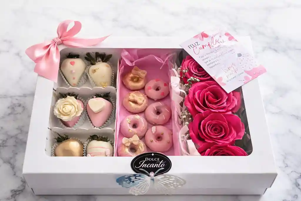 Una gift box de presentación blanca con tapa de ventana de acetato transparente, decorada con un gran lazo de cinta satinada rosa y una mariposa en el frente. En su interior encontraras tres secciones: 4 rosas 6 fresas cubiertas con chocolate, decoradas de manera muy detallada 8 mini donas cubiertas de chocolate blanco y rosa decoradas de una manera hermosa y elegante puedes escoger una Tarjeta personalizada