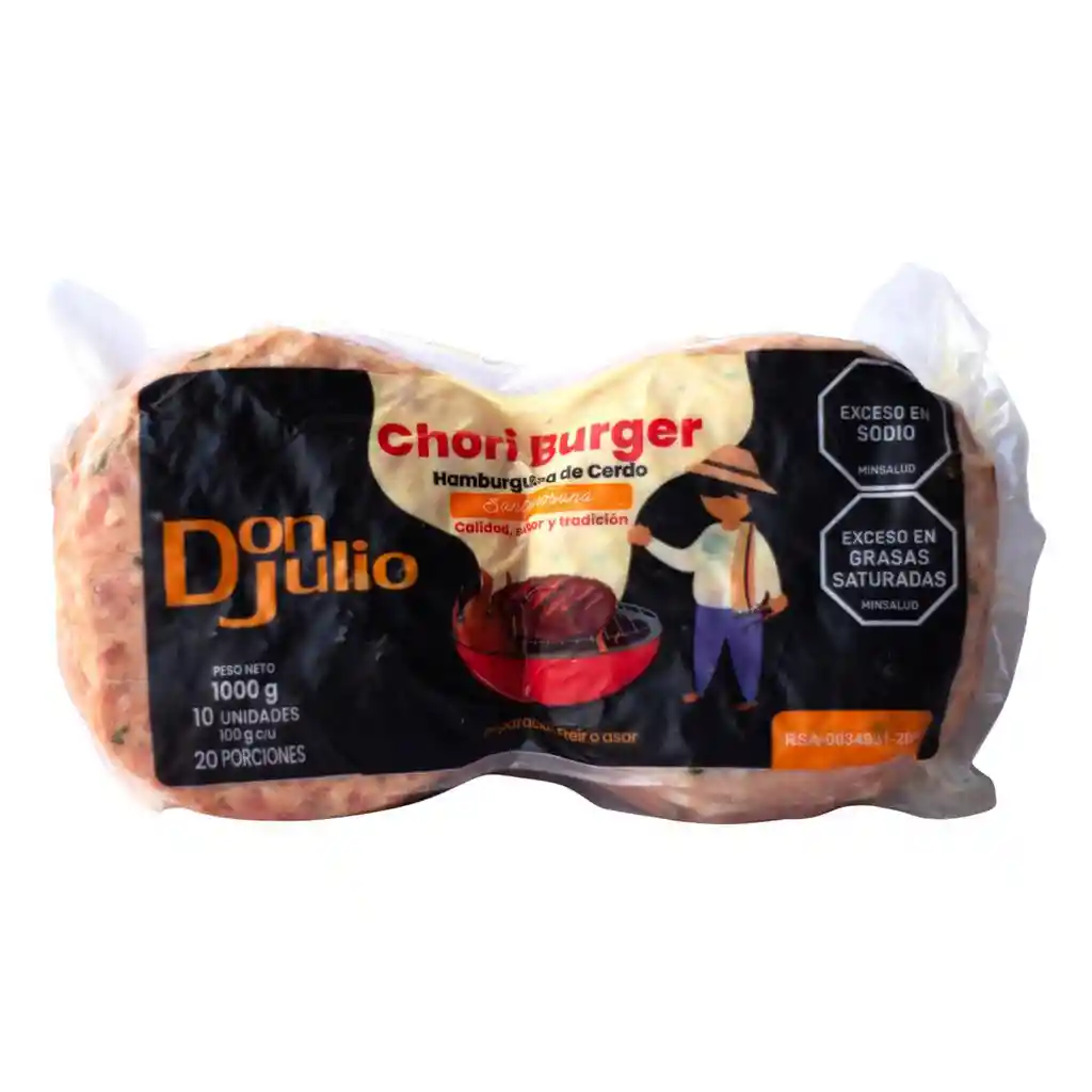 Don Julio Hamburguesa de cerdo en presentación de 10 unidades | peso por unidad 100 g / 3.52 oz | peso neto total 1 kg | producto elaborado a base de carne de cerdo condimentada | formato individual uniforme que facilita el control de porciones | textura firme que se mantiene durante la cocción | requiere cocción completa antes del consumo | adecuada para preparar a la parrilla | sartén | plancha | horno.