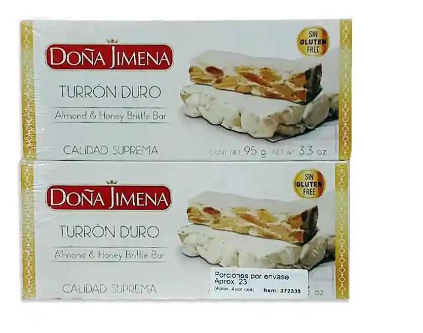 Descripción Sumérgete en el sabor tradicional y la calidad suprema del Turrón de Doña Jimena. Este exquisito dulce, elaborado con almendra, miel y clara de huevo, viene en una presentación de 6 unidades de 95 g cada una. Disfruta de su textura crujiente y su suave combinación de ingredientes que se derriten en tu boca. Además, este turrón es sin gluten, lo que lo convierte en una opción perfecta para aquellos con necesidades dietéticas especiales. Ingredientes Almendras tostadas (UE y sin UE) (60 %), jarabe de glucosa y fructosa miel (13 %), azúcar, clara de huevo. Oblea de recubrimiento (fécula de patata, aceite de girasol refinado Información del producto Doña Jimena Turrón 6 unidades de 95 g, contenido neto 570 g / 20.1 oz | Deleita tus sentidos con el auténtico sabor de este clásico navideño que Doña Jimena ha perfeccionado a lo largo de los años | Almacenar en un lugar fresco y seco. Etiquetas Vegetariano Sin gluten Libre de lactosa Especificaciones Almacenamiento Lugar fresco y seco País de origen España Importado o Nacional Importado Gusto Dulce AlérgenosNueces (por ejemplo: almendras, nueces, pecanas). Puede contenerNueces (por ejemplo: almendras, nueces y pecanas). Tamaño de la unidad (cada uno) 95.0000 g Peso neto 570.0000 g Cantidad de paquetes (recuentos) 6 Marca Doña Jimena Garantía del vendedor: 30 días