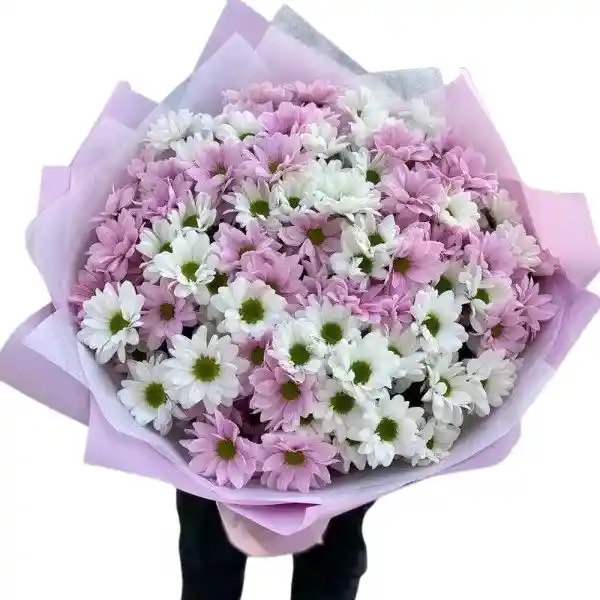 Bouquet de 2 paquetes de margarita blanca y morada Nota: La flor puede ser sustituida dependiendo la disponibilidad de color y del producto “Mensaje Personalizado” máximo de 30 caracteres (Dejar el mensaje en el chat, los comentarios no se previsualizan para la tienda por lo que si se dejan allí no podrá ser incluido).
