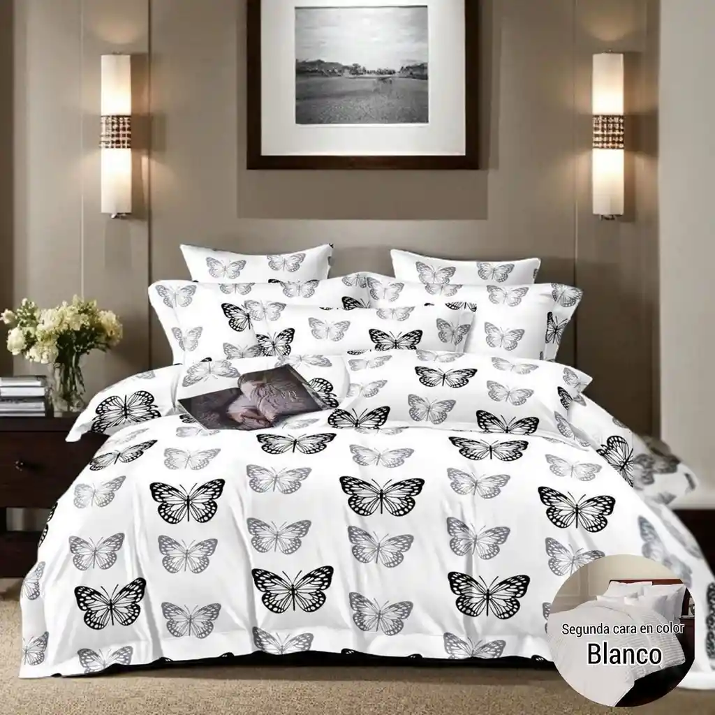 Transforma tu habitación en un oasis de comodidad y estilo con nuestro edredón doble faz de alta calidad. Diseñado para proporcionarte un sueño reparador y un toque de elegancia en tu decoración. Características: Material extrasuave: Microfibra de alta calidad que te envuelve en comodidad y suavidad. Doble faz: Una cara con un estampado vibrante y colorido, y la otra con un tono blanco puro y elegante. Relleno de alta calidad: Fibra siliconada de 180 gramos que proporciona calidez y ligereza. Incluye: 1 edredón doble faz con estampado y blanco. 2 fundas para un fácil lavado y mantenimiento. 2 cojines decorativos para agregar un toque de estilo a tu habitación. Diseño versátil: Puedes elegir la cara que prefieras según la temporada o tu estado de ánimo. Especificaciones: Cama doble: Diseñado para camas de 140x190 cm. Altura del colchón: Compatible con colchones de hasta 28 cm de altura. Importante: La imagen fue ambientada y solo incluye los elementos mencionados en el apartado ""Incluye"". No incluye otros objetos o decoraciones que puedan aparecer en la imagen. Cuidados y Mantenimiento: Lavar en ciclo suave con agua fría. No usar blanqueador ni productos químicos agresivos. No retorcer ni exprimir excesivamente. Secar al aire libre o en secadora a baja temperatura. Planchar a baja temperatura si es necesario. ¡Duerme como en un sueño! Nuestro edredón doble faz es perfecto para cualquier persona que busque comodidad, estilo y versatilidad en su hogar. ¡No te pierdas la oportunidad de experimentar el sueño perfecto!