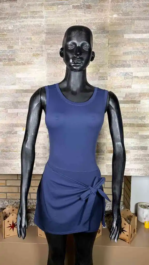 Vestido deportivo tipo enterizo para mujer talla S en color azul navy, diseñado para brindar comodidad, estilo y libertad de movimiento. Su material suave y elástico se adapta al cuerpo, ideal para actividades como caminar, gimnasio, tenis, pickleball, yoga, ciclismo recreativo o incluso para usar en piscina y playa. Incluye una falda integrada con amarre lateral, que añade un toque moderno y favorecedor. La parte superior cuenta con cuello redondo y espalda profunda, ofreciendo frescura y una silueta estilizada. Este modelo es perfecto si buscas una prenda funcional, ligera y versátil que puedas usar tanto para entrenar como para salir casualmente. Características destacadas: Material suave, flexible y de rápido secado Diseño enterizo con falda superpuesta Lazo lateral ajustable estilo “wrap” Espalda profunda para mayor frescura Ideal para deporte, caminatas, playa y uso diario Corte cómodo que estiliza la figura
