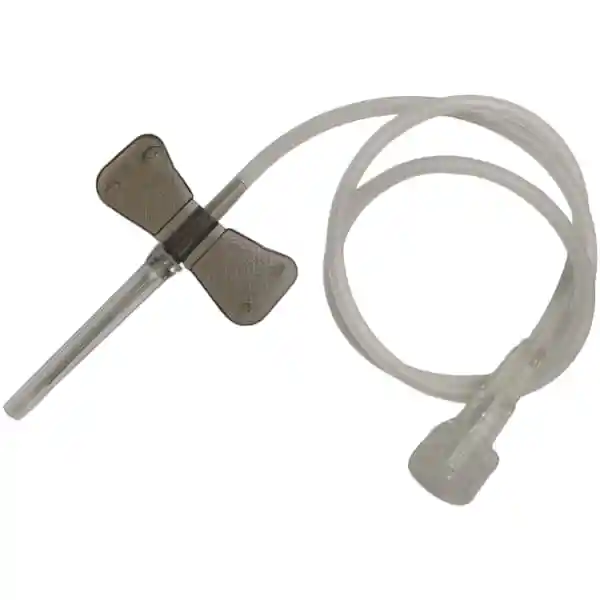 equipo para infusion pericraneal calibre 22G, aguja de acero inoxidable grado médico, lubricada con silicona, punta delgada y tribiselada. Alas flexibles de fácil manipulación, identificación con código de colores. Esterilización ETO No tóxico libre de pirógenos, hipoalergénico Tubuladora de PVC Plegable y con memoria de forma. Conector Luer que permite ajuste hermético con otros dispositivos.
