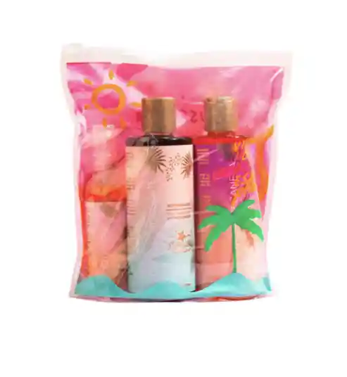 El Kit Summer Vacations, incluye: 1 Bronceador Coco- Chocolate por 250 ml. 1 Bronceador Zanahoria-Canela por 250 ml. 1 Rocío de Oro para aclarar los vellitos de brazos, piernas y abdomen por 60 ml. Estuche para guardar los 3 productos.