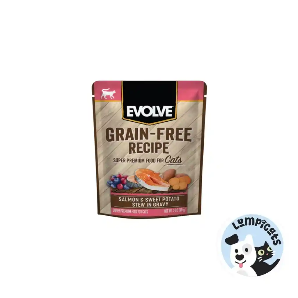 EVOLVE CAT GRAIN FREE POUCHE SALMON Y PATATAS DULCES 3 OZ - 85 GR La receta Evolve Cat Grain Free Pouch con Salmón y Patatas Dulces es una opción de comida húmeda para gatos diseñada para ofrecer una nutrición completa y equilibrada sin cereales, ideal para gatos con sensibilidades alimentarias o que siguen una dieta libre de granos. Presenta una textura suave y jugosa, fácil de consumir, que satisfará el paladar de tu gato. Características principales: Proteína de alta calidad: El salmón es el ingrediente principal, proporcionando una fuente excelente de proteínas y ácidos grasos omega-3 que ayudan a mantener la salud de la piel, el pelaje y el sistema cardiovascular. Sin cereales: Libre de granos como trigo, maíz o soja, lo que hace de esta receta una opción adecuada para gatos con sensibilidad o alergias a los cereales. Patatas dulces: Este ingrediente es una fuente natural de fibra y carbohidratos complejos, lo que contribuye a una digestión saludable y proporciona energía de liberación lenta. Aditivos nutricionales: Formulado con una mezcla balanceada de vitaminas y minerales esenciales para mantener la salud general de tu gato, incluyendo un sistema inmunológico fuerte y un buen funcionamiento del metabolismo.
