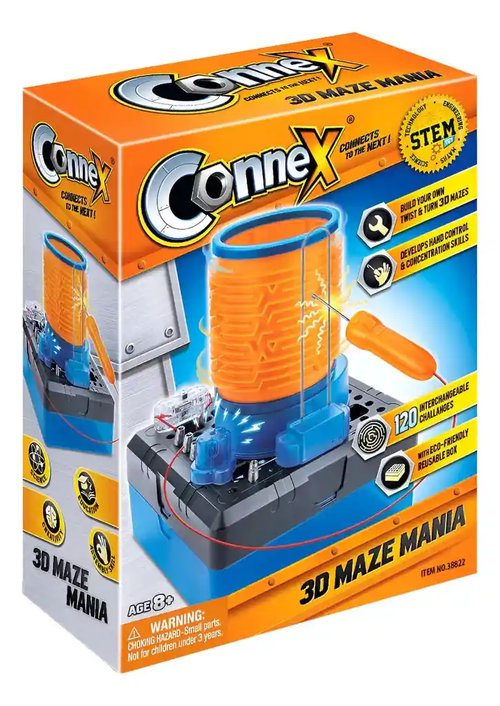 Empaque de regalo sin costo adicional, escríbenos al finalizar la compra. 8 años + ¡Prepárate para un reto lleno de emoción con el Laberinto Manía 3D ! Este kit educativo es perfecto para niños que quieran explorar los principios básicos de la física mientras se divierten. El Laberinto Manía 3D permite a los pequeños científicos poner a prueba su destreza y concentración, ya que deberán guiar una varita a través de un complejo laberinto tridimensional sin tocar los cables. El desafío está basado en un sencillo principio de circuito electrónico. Cuando enciendes el juego, la electricidad fluye a través del motor que activa el laberinto. Pero cuidado, si la varita toca el cable del laberinto, una alarma se activará emitiendo un sonido que indicará que ha fallado el desafío. Tu objetivo es guiar la varita desde la entrada inferior hasta la salida superior sin que suene la alarma. ¡Es una carrera de precisión y habilidad! Requiere 2 pilas AA (no incluidas).