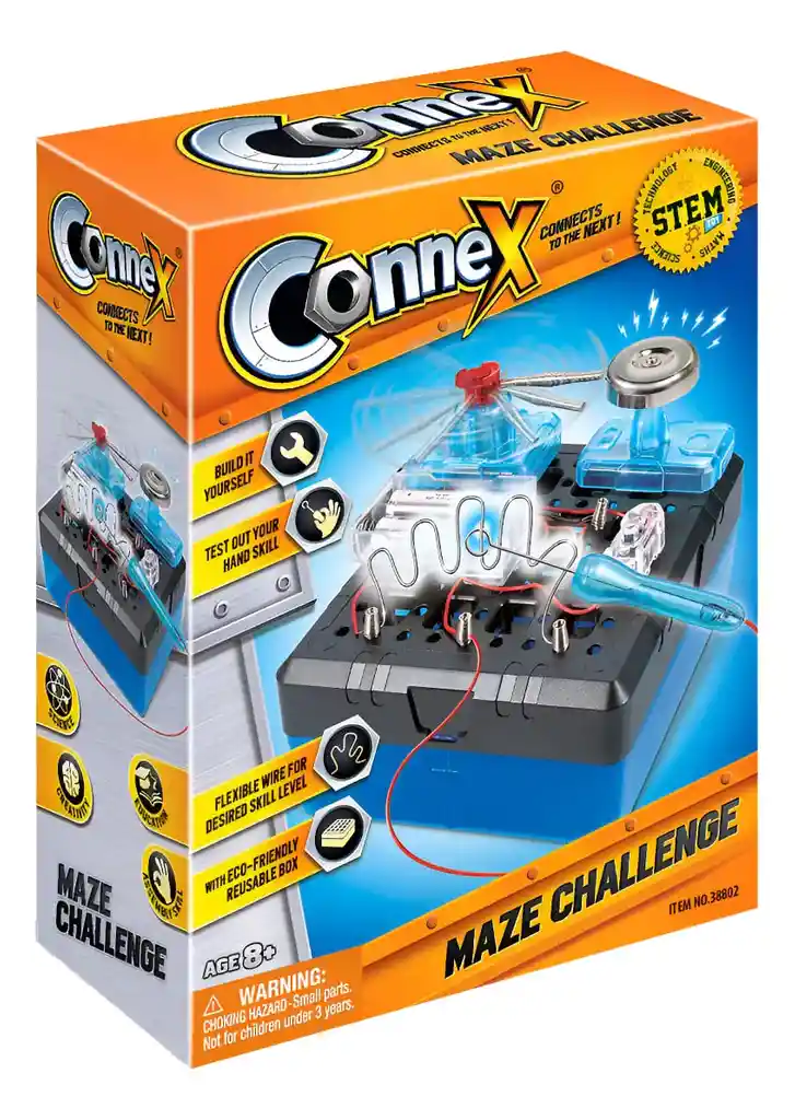 Empaque de regalo sin costo adicional, escríbenos al finalizar la compra. 8 años + ¡Descubre el emocionante mundo de la ciencia con el Desafío del Laberinto de CONNEX! Este kit educativo les permitirá explorar principios básicos de electrónica de manera divertida y educativa. ¡Ponte a prueba con este fascinante desafío! Construye tu propio laberinto eléctrico y aprende cómo funciona la electricidad en circuitos sencillos. El objetivo es guiar una varita a través del laberinto sin tocar los alambres metálicos. Si la varita toca el alambre, la electricidad fluye y suena una campana, indicando que has fallado el desafío. ¡Perfecto para poner a prueba tus habilidades y mejorar tu destreza! El kit viene con una caja ecológica reutilizable que no solo sirve como base para construir tu experimento, sino que también es ideal para almacenar todas las piezas y llevar tu laberinto a cualquier parte. ¡Prepárate para horas de diversión y descubrimiento con el Desafío del Laberinto! Aprende cómo los circuitos funcionan y mejora tus habilidades en un entorno interactivo. Requiere 2 pilas AA (no incluidas)