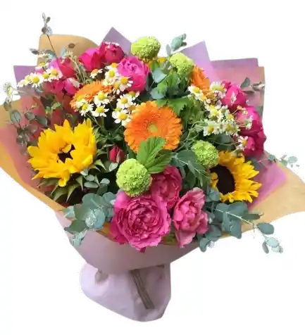 Bouquet multicolor con girasoles, gerberas y flores complementarias, elaborado con flores frescas de alta calidad y diseño profesional lleno de armonía y estilo. Algunas flores pueden variar sutilmente según la temporada, manteniendo siempre la frescura, el diseño y el valor del arreglo. Incluye tarjeta personalizada sin costo para acompañar tu mensaje especial.