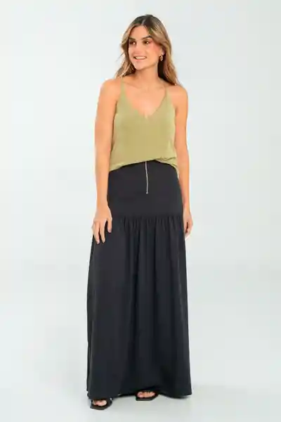 Midi en Tejido Plano Fondo Entero Talle Alto Pretina de 5 cm Cierre Niquel Con Corredera Decorativa Bolsillos en Los Laterales Corte Con Recogido Suave y Parejo Corte en Centro Espalda Ruedos de 0.8 cm Silueta Semi Ajustada.