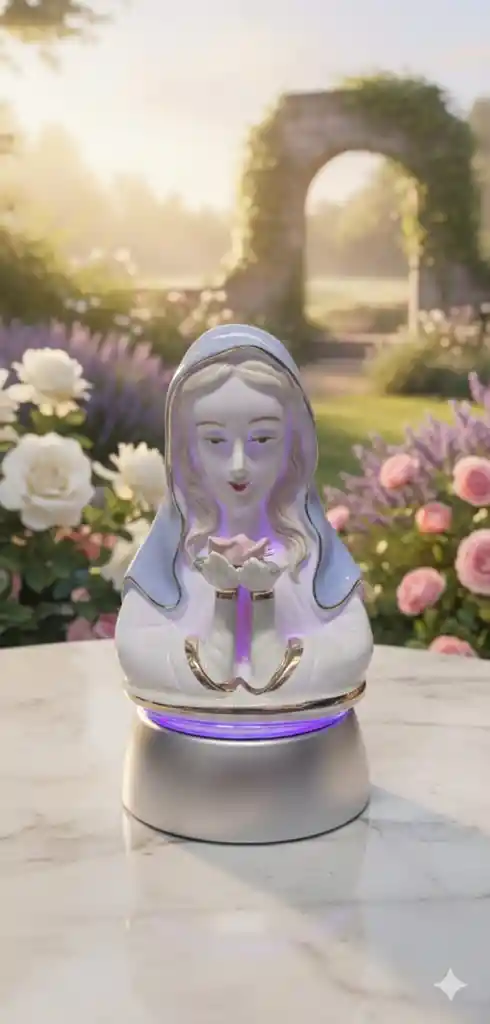 Figura Religiosa Virgen Rosa Mística con Luz 16 cm Porcelana Esta figura de la Virgen Rosa Mística, elaborada en porcelana de alta calidad, incorpora un sistema de iluminación a batería que resalta sus detalles y crea un ambiente de paz en cualquier espacio. Su diseño tradicional, acompañado por un acabado fino y delicado, la convierte en una pieza ideal para altares domésticos, habitaciones y lugares de oración. Características: Material: Porcelana fina de alta calidad Altura: 16 cm Iluminación: Luz integrada Alimentación: Funciona con batería Acabado: Pintura fina con detalles cuidadosamente elaborados Diseño: Representación clásica de la Virgen Rosa Mística con sus tres rosas distintivas Uso: Perfecta para altares domésticos, espacios religiosos y como regalo espiritual