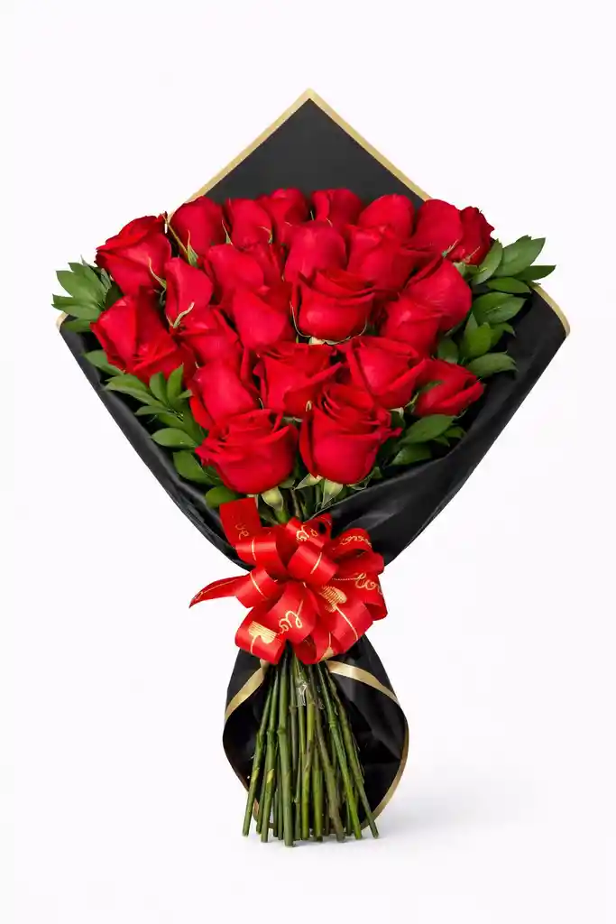 Ramo floral con 20 unidades de rosas rojas en envoltura de papel coreano.