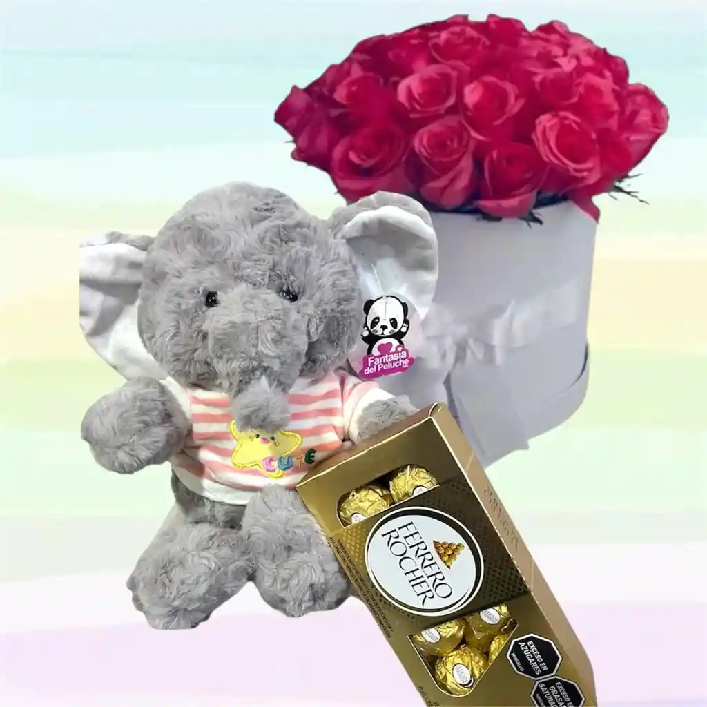 Set de regalo con peluche elefante gris: Incluye un adorable peluche de elefante gris de 30 cm, una caja con 24 rosas frescas y un paquete de chocolates Ferrero Rocher x8. Un detalle tierno y especial para sorprender en cualquier ocasión. Imagen de referencia*