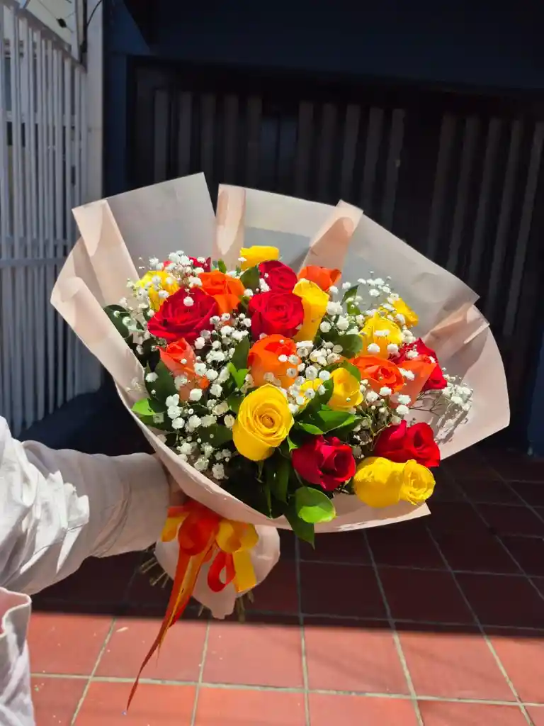 Ramo de rosas en variedad de colores pueden ser rojas, rosadas, fucsia, amarilla, naranja , blanca , lila entre otros. Puede llegar combinada 3 colores o mas Decorado con papel coreano Si deseas algún mensaje déjalo en comentarios o escríbenos El color de papel puede variar según disponibilidad