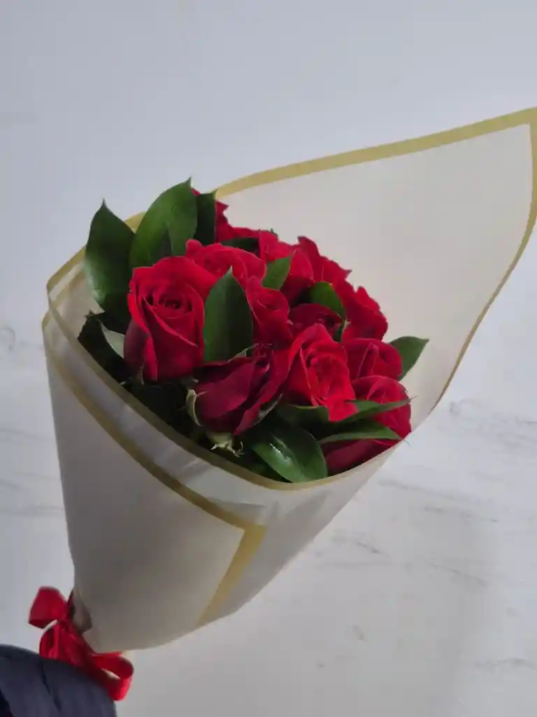 Ramo de rosas 12 rosas rojas con follajes, decorado con papel coreano moño en cinta satinada. Si deseas algún mensaje déjalo en comentarios o envíanos un mensaje El color del papel puede variar según disponibilidad
