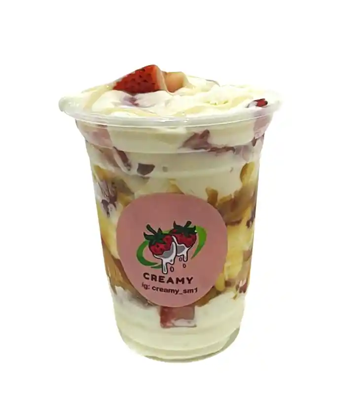 Vaso de 12 onzas (aproximadamente 355ml) con crema de la casa, fresa, borde de arequipe y leche condensada