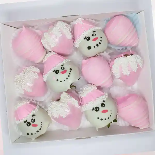 Caja por 12 fresas con chocolate Tonos: Blanco, rosa o azul Topping: Perlas comestibles Decoración navideña