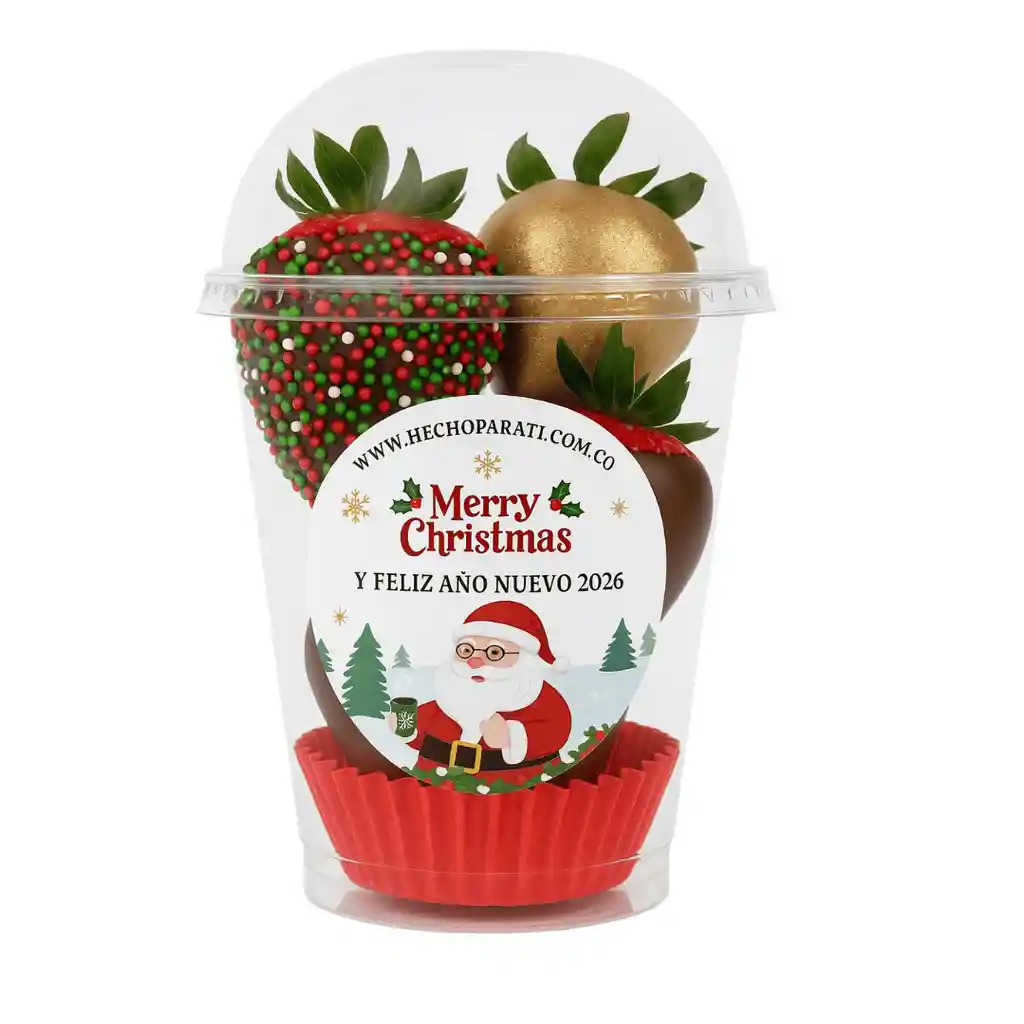 Fresas frescas bañadas en chocolate premium, decoradas con sprinkles navideños y detalles dorados, presentadas en una copa transparente edición especial Navidad y Año Nuevo 2026 un detalle delicioso, elegante y perfecto para regalar, sorprender o disfrutar en esta temporada.