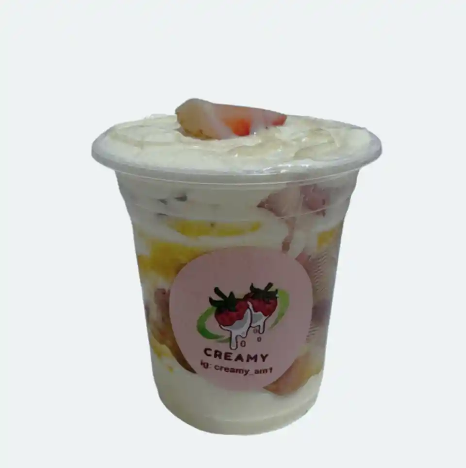 Vaso de 9 onzas (aproximadamente 266ml) con crema de la casa, fresas, borde de arequipe y leche condensada