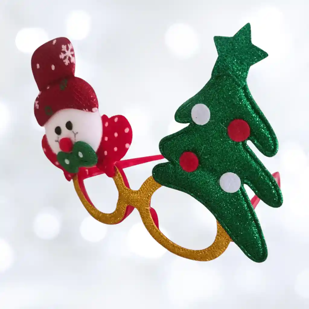 Gafas en pasta con detalle de árbol de navidad y muñeco de nieve, funciona para niños y adultos ya que se adapta fácilmente. Accesorio para navidad, accesorios navideños, novenas, celebracion navidad.