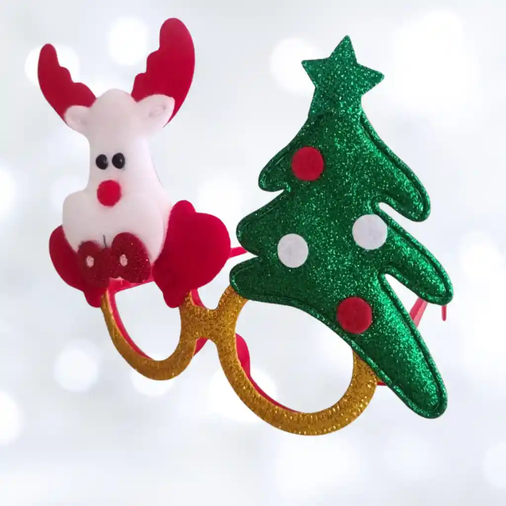 Gafas en pasta con detalle de árbol navideño y reno, funciona para niños y adultos ya que se adapta fácilmente. Accesorio para navidad, accesorios navideños, novenas, celebracion navidad.