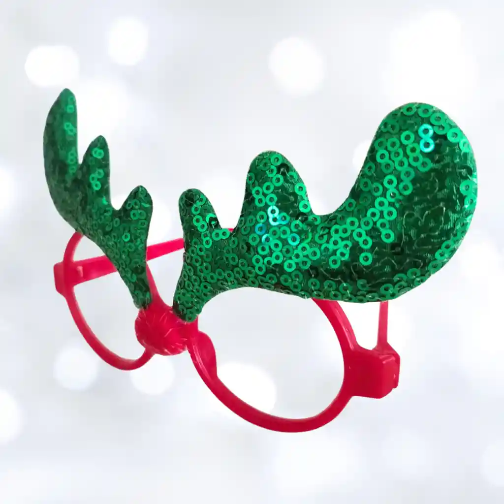 Gafas en pasta con detalle de orejas de reno en color verde, funciona para niños y adultos ya que se adapta fácilmente. Accesorio para navidad, accesorios navideños, novenas, celebracion navidad.