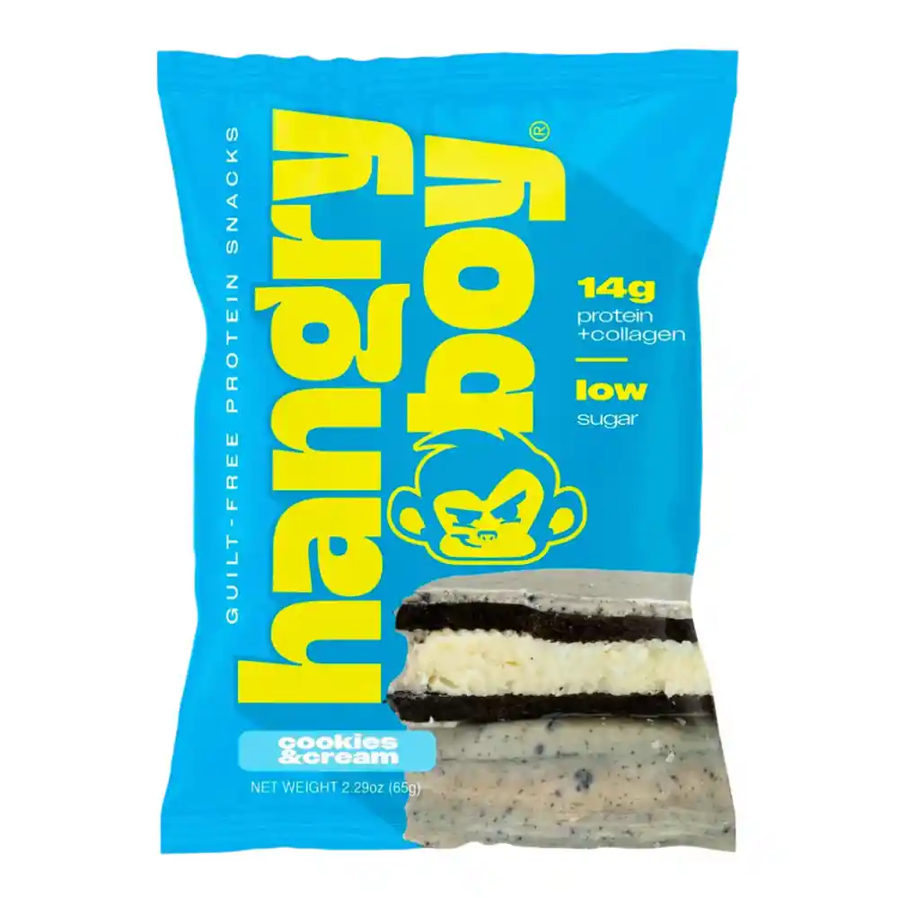 La Galleta Proteínica Hangry Boy es un snack tipo sándwich relleno que combina sabor y nutrición, ideal para personas activas o quienes buscan controlar antojos de manera saludable. Cada galleta de 65 g aporta alrededor de 14 g de proteína y solo 5 g de azúcar, sin azúcares añadidos, además de ser libre de gluten, grasas trans y OGM. Es práctica para después del entrenamiento o como snack entre comidas, aunque contiene lactosa y frutos secos en algunas versiones, por lo que conviene revisar los alérgenos en el empaque.