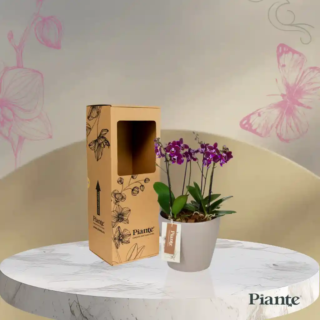 Giardino Felicità es el detalle perfecto para llevar la frescura y el encanto de la naturaleza a cualquier espacio. Este versátil arreglo de orquídeas mini en matera taupe incluye un mínimo de 5 espigas florales, cuidadosamente cultivadas en una variedad de colores para adaptarse a tu estilo. Cada orquídea alcanza una altura aproximada de entre 15 y 25 cm, proporcionando el equilibrio perfecto entre delicadeza y presencia. La matera taupe de 18 cm de diámetro añade un toque moderno y sofisticado, resaltando su belleza natural. Gracias a su versatilidad, Giardino Felicità se integra de manera ideal en hogares, oficinas o espacios especiales, transmitiendo alegría y estilo en cualquier ambiente. ¡Ilumina tus espacios y comparte momentos inolvidables con este vibrante símbolo de felicidad! Incluye: Empaque de lujo PIANTE, listo para regalar. Tarjeta personalizada con mensaje o dedicatoria. Ritual para cultivar el Amor en San Valentín Etiqueta con las indicaciones de cuidado para la planta.