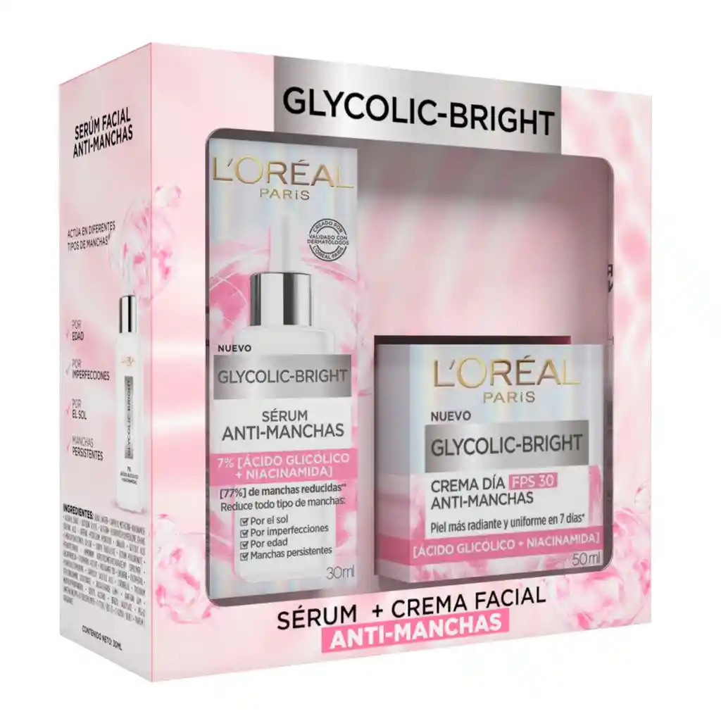 El pack Glycolic Bright ofrece una rutina facial pensada para que potencies la uniformidad del tono y atiendas la apariencia de manchas mediante la acción combinada del sérum de 30 mL y la crema facial de 50 mL con FPS 30, formulados con ácido glicólico y niacinamida, dos ingredientes conocidos por contribuir a una piel con aspecto más luminoso y homogéneo; el sérum tiene una textura ligera adecuada para uso diario, mientras que la crema complementa la rutina con hidratación y protección solar, de modo que mantengas una aplicación continua que favorezca una apariencia más pareja en el rostro. Información del producto: Loreal Pack Glycolic Bright Serum 30 mL + Crema 50 mL ofrece una rutina facial complementaria formulada con ácido glicólico y niacinamida | combinación que contribuye a mejorar la apariencia de manchas y apoyar un tono más uniforme | incluye un sérum de textura ligera adecuado para uso nocturno y una crema facial con FPS 30 indicada para el día | ambos productos pueden utilizarse en rutinas de cuidado regular aplicando el sérum sobre el rostro limpio y la crema como último paso diurno para complementar hidratación y protección.