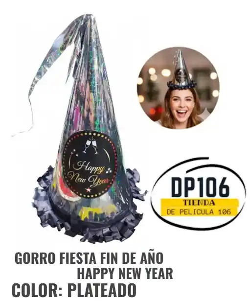¡Recibe el Año Nuevo con un toque de brillo y color! Este llamativo Gorro de Fiesta "Happy New Year" en color plateado es el accesorio perfecto para tu celebración de Nochevieja. Su diseño cónico, con un estampado holográfico brillante, incluye flecos decorativos negros y la frase "Happy New Year", asegurando que tú y tus invitados luzcan festivos y memorables durante toda la noche.