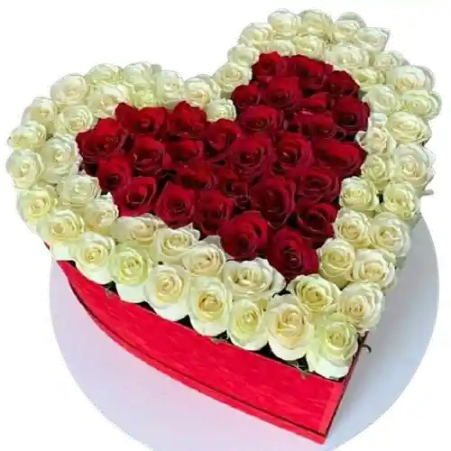 Arreglo en forma de corazón con rosas blancas y centro de rosas rojas, elaborado con flores frescas de alta calidad y diseño profesional de alto impacto. Algunas flores pueden variar sutilmente según la temporada, manteniendo siempre la elegancia, la frescura y el valor del arreglo. Incluye tarjeta personalizada sin costo para acompañar tu mensaje especial.