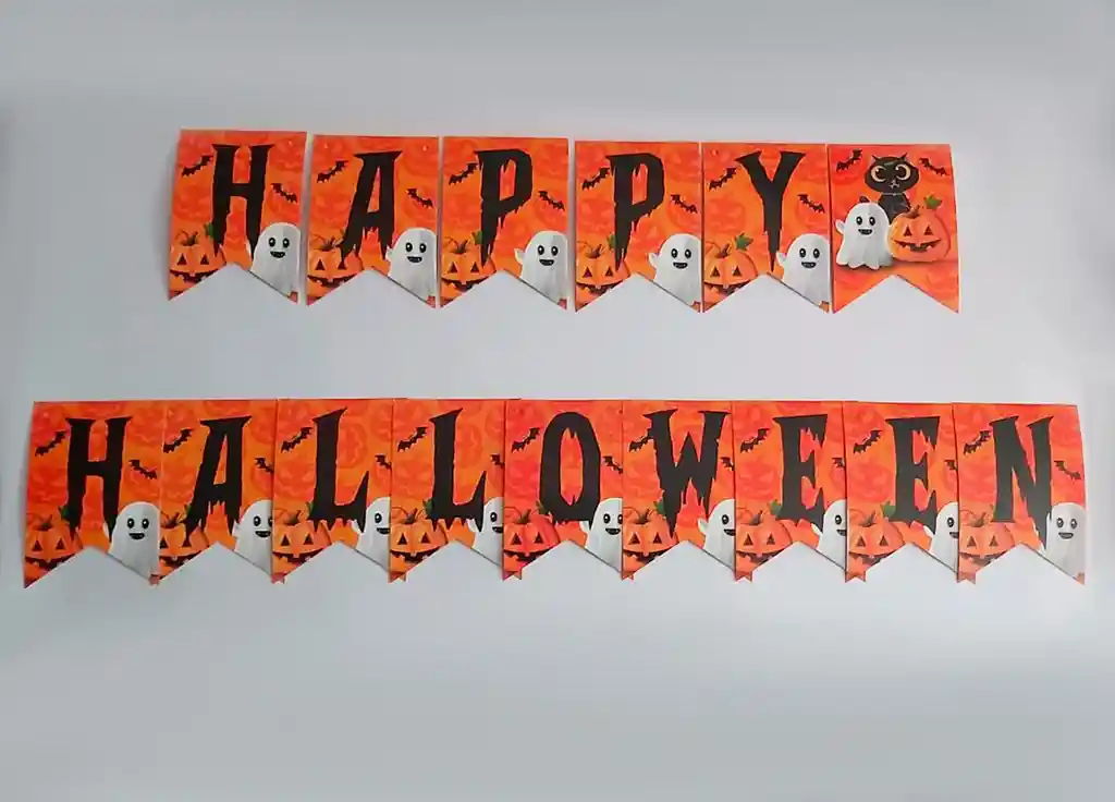 Guirnalda HAPPY HALLOWEEN tipo banderín, la guirnada tiene un tamaño aproximado de 2,5 metros y cada banderín mide 12cm x 16cm