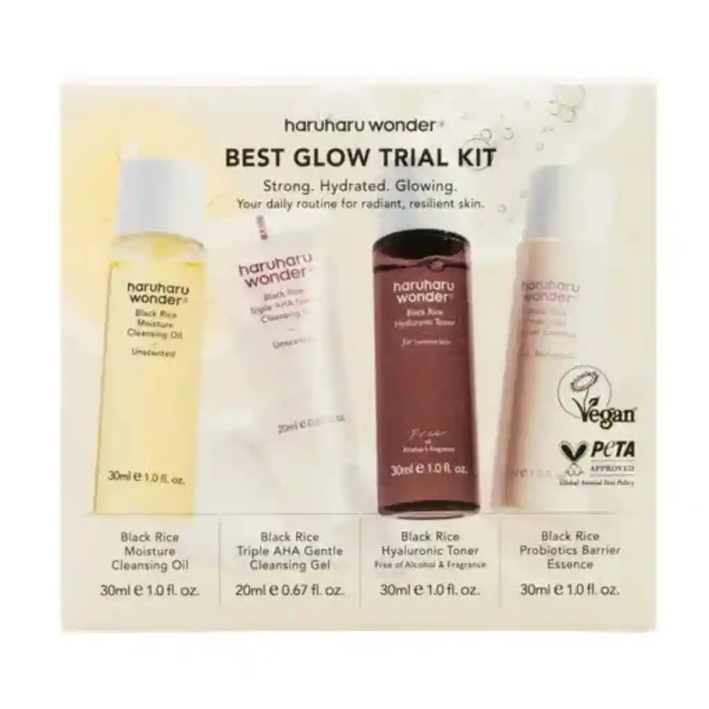 El Haruharu Wonder Best Glow Trial Kit es el set perfecto para quienes buscan esa famosa piel de cristal (glass skin) sin complicaciones. Este kit reúne los productos más icónicos de la marca, conocidos por su tecnología de fermentación que permite que los ingredientes penetren más profundamente en la piel. Este set de 4 piezas es una rutina completa de viaje o prueba que se centra en la hidratación intensa, la reparación y la luminosidad. Utiliza el poder del arroz negro fermentado (rico en antioxidantes) para proteger la piel del envejecimiento prematuro y el estrés ambiental. Es la solución ideal para transformar una piel opaca y cansada en una piel radiante y llena de vida. Incluye: Black Rice Moisture Cleasing Oil (30ml): Es el primer paso de la doble limpieza. Disuelve suavemente el maquillaje, el protector solar y el exceso de grasa en los poros sin dejar sensación grasosa ni irritar los ojos. Black Rice Triple AHA gentle cleasing gel (20ml): Un limpiador al agua que utiliza tres tipos de AHA naturales para exfoliar suavemente las células muertas mientras lavas tu rostro. Deja la piel suave, lisa y con una textura renovada. Black Rice Hyaluronic toner (30ml): El tónico "estrella" que aporta una hidratación instantánea y profunda. Prepara la piel para absorber mejor los siguientes productos, calmando cualquier irritación. Black Rice Probiotics barries Essence (30ml): Una esencia avanzada cargada de probióticos que refuerzan las defensas naturales de la piel. Es clave para reparar la barrera cutánea, calmar rojeces y evitar la pérdida de humedad.