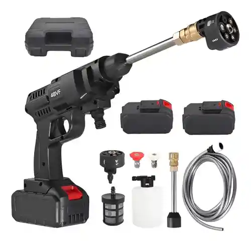 Esta hidrolavadora portátil de 48V te ofrece la potencia de un equipo profesional con la comodidad de un diseño inalámbrico. Su sistema de doble batería garantiza mayor autonomía, permitiéndote limpiar autos, motos, terrazas o fachadas sin interrupciones. Gracias a su boquilla de 6 chorros ajustables, puedes controlar la presión según la superficie: desde un lavado suave hasta una limpieza a fondo. Además, su pistola pulverizadora distribuye el agua con precisión y su tanque de 400 mL facilita la aplicación de jabón o espuma para un resultado impecable. Su motor silencioso de 60 dBA permite trabajar cómodamente en espacios residenciales, y su temperatura máxima de 60 °C elimina la suciedad más difícil sin esfuerzo. Con un diseño compacto y fácil de transportar, esta hidrolavadora se adapta a tus necesidades diarias, brindándote un rendimiento profesional donde lo necesites. Ventajas clave: Doble batería recargable: mayor duración y libertad total. Boquilla 6 en 1: ajusta la presión según el tipo de limpieza. Motor potente y silencioso. Diseño portátil, ideal para uso en exteriores o lugares sin corriente eléctrica. Fácil montaje y almacenamiento.