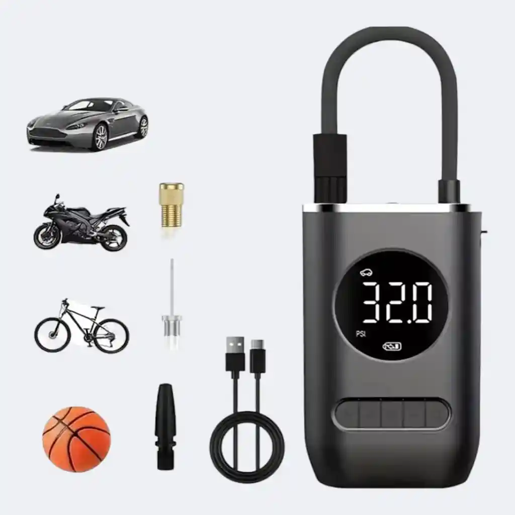 *Bomba de aire multifunción inalámbrica adecuada para inflar neumáticos de coches, motos, bicicletas, balones, flotadores de natación y objetos inflables. Característica *Velocidad de movimiento de 21000 rpm para un inflado rápido. *Capacidad para ajustar la presión de los neumáticos de 0 a 150 PSI en solo 20 segundos. *Chip AI inteligente para determinar la presión de los neumáticos automáticamente al conectar la manguera de la bomba a la válvula del neumático y presionar el botón de inicio. *Sensor de presión de aire con chip de alta tecnología que ofrece una precisión con un nivel de error de ±1 PSI. *Amortiguadores especiales para reducir el ruido, con un nivel de ruido aproximado de 40 dB. *Batería de litio incorporada de 2 * 2000 mAh para una duración prolongada. *Iluminación LED para facilitar su uso en condiciones de poca luz. Especificaciones *Material: ABS. *Corriente: 10A. *Voltaje: 7.4V. *Potencia: 50W. *Flujo de presión de aire: 25L/min. *Tipo de energía: Recargable TIPO-C.