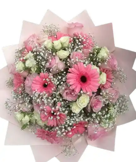 Bouquet floral en tonos rosados con gerberas y rosas, elaborado con flores frescas de alta calidad y un diseño elegante lleno de armonía. Algunas flores pueden variar sutilmente según la temporada, manteniendo siempre la frescura, el estilo y el valor del arreglo. Incluye tarjeta personalizada sin costo para acompañar tu mensaje especial.