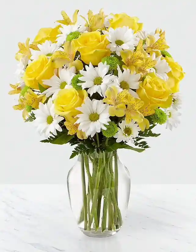 Jarrón amarillo de 12 rosas 1 paquete de margarita y 1 paquete de astromelia Nota: La flor puede ser sustituida dependiendo la disponibilidad de color y del producto “Mensaje Personalizado” máximo de 30 caracteres (Dejar el mensaje en el chat, los comentarios no se previsualizan para la tienda por lo que si se dejan allí no podrá ser incluido).