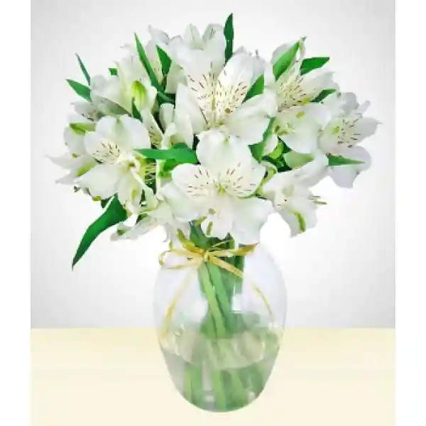 Un elegante jarrón con aproximadamente 10 varas de astromelias blancas, símbolo de pureza y tranquilidad. Perfecto para decorar con sutileza y sofisticación.Nota: La flor puede ser sustituida dependiendo de la disponibilidad de color y del producto."Mensaje Personalizado" máximo de 30 caracteres (Dejar el mensaje en el chat, los comentarios no se previsualizan para la tienda, por lo que si se dejan allí no podrá ser incluido).
