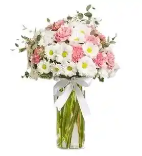 jarron de 1 paquete de margarita blanca con 20 claveles rosados y eucalipto Nota: La flor puede ser sustituida dependiendo la disponibilidad de color y del producto “Mensaje Personalizado” máximo de 30 caracteres (Dejar el mensaje en el chat, los comentarios no se previsualizan para la tienda por lo que si se dejan allí no podrá ser incluido).