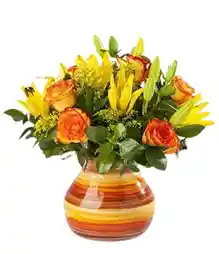 jarron de 6 rosas naranjas , 4 lirios amarillos acompañados de rusco y soliago .La flor puede ser sustituida dependiendo la disponibilidad de color y del producto “Mensaje Personalizado” máximo de 30 caracteres (Dejar el mensaje en el chat, los comentarios no se previsualizan para la tienda por lo que si se dejan allí no podrá ser incluido)