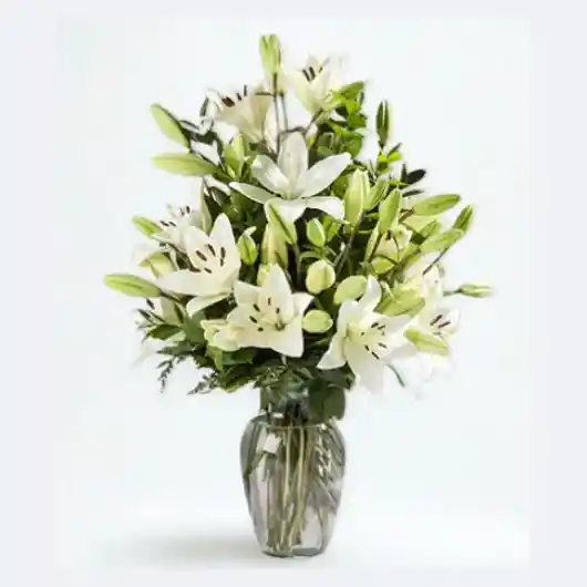 Jarron de aprox. 12 lirios con 10 varas de rusco. La flor puede ser sustituida dependiendo la disponibilidad de color y del producto “Mensaje Personalizado” máximo de 30 caracteres (Dejar el mensaje en el chat, los comentarios no se previsualizan para la tienda por lo que si se dejan allí no podrá ser incluido)