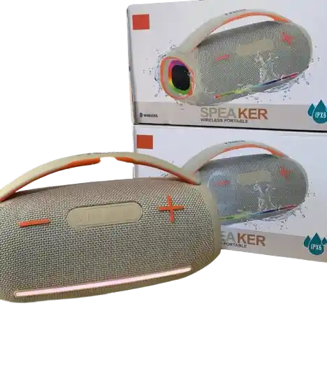 Parlante inalámbrico portátil con diseño moderno y acabado elegante, ideal para acompañar tus espacios con música de alta calidad. Su estructura cilíndrica, detalles en color y luces integradas le dan un aspecto atractivo y dinámico. Incorpora asa superior para facilitar el transporte y ofrece una experiencia sonora potente y envolvente.