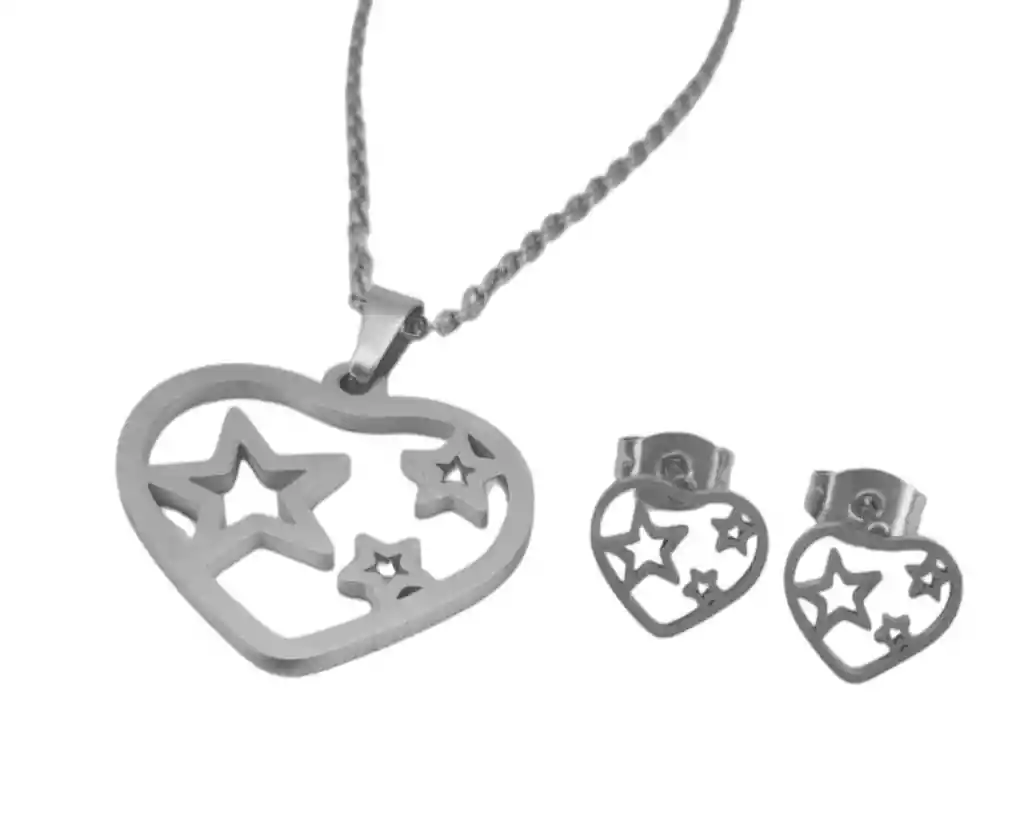 Presentación: Set de Collar y Aretes Material: Acero Quirúrgico Color: Plateado Diseño: Corazón Tres Estrellas Producto Hipoalergénico. Cadena de 40cm Caracteristicas: Es un material que no se oxida, no se oscurece con el tiempo, su tonalidad y brillo no se alteran. Es Antialérgico, la cantidad de níquel que tiene es residual por lo que en rarisimas ocasiones causa alergias. No necesita mantenimiento. Es un material duro, 1000 veces más duro que el platino y no se deforma.