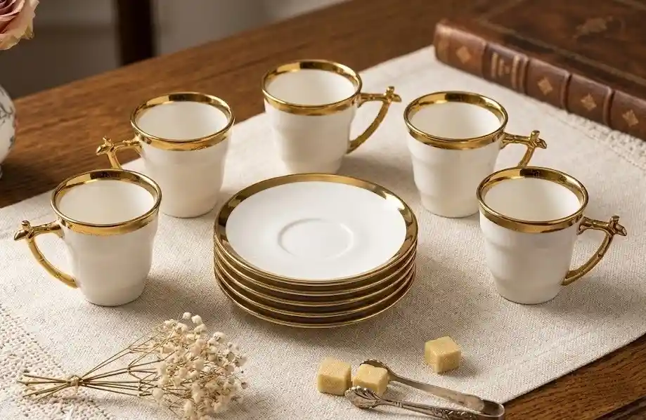 Juego De Taza Pocillo Y Platos De Servicio Tintero X4 Color Blanco Con Bordes Dorados En Porcelana