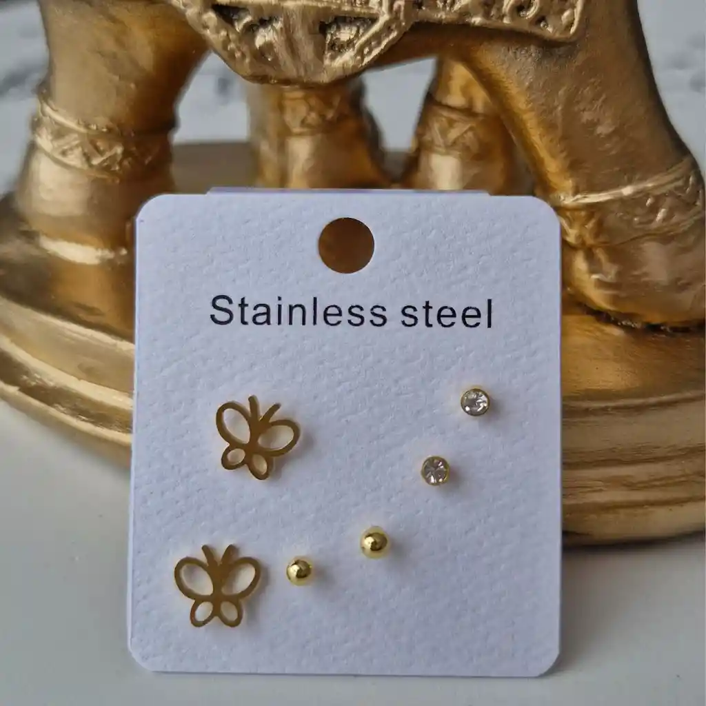 Presentación: Topitos x3 Material: Acero Color: Dorado Diseño: Mariposa Medida: 0.5 cm Características: Hipoalergénico El acero es un material que no se oxida No se oscurece con el tiempo, su tonalidad y brillo no se alteran No necesita mantenimiento Se recomienda no aplicar perfume directamente