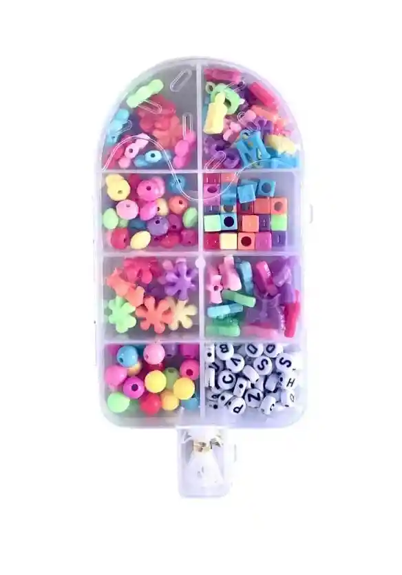 Divertido Set de accesorios para hacer pulseras o manillas para niña Con estuche en forma de paleta Incluye: Chaquiras, letras, cauchos, entre otros accesorios Medidas del estuche: 15 cm x 7 cm