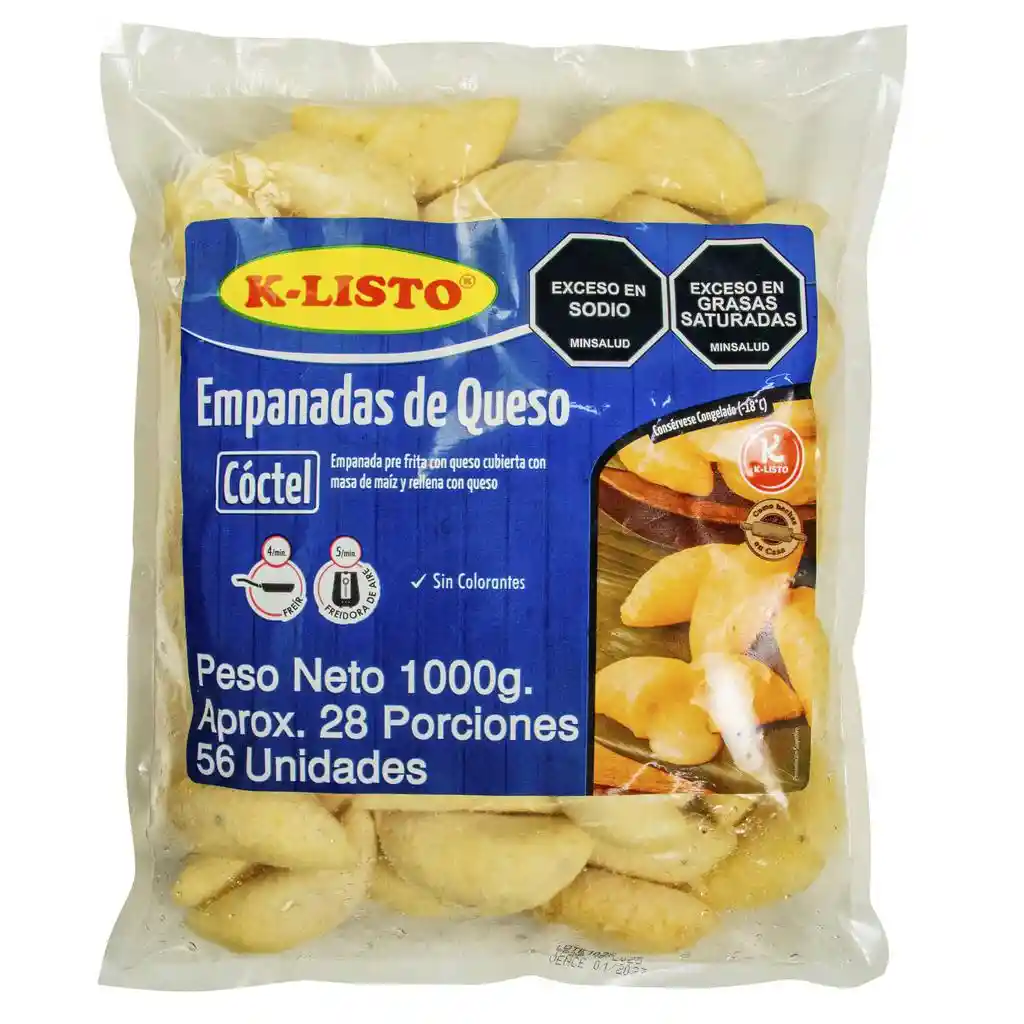 K‑Listo Empanadas de queso tipo cóctel K-Listo, elaboradas con masa de maíz y relleno de queso | Presentación: paquete de 56 unidades, aproximadamente 28 porciones | Características: empanadas pequeñas con exterior dorado y textura crujiente al calentarse, rellenas con queso fundente | Uso sugerido: ideales como aperitivo, snack o para compartir en reuniones y eventos | Preparación: pueden calentarse en freidora, horno o freidora de aire hasta que estén completamente calientes y doradas | Aplicaciones: adecuadas para bandejas de pasabocas, acompañar con salsas o como complemento en comidas informales | Conservación: mantener congeladas a −18 °C hasta su uso y no recongelar una vez descongeladas para preservar sus características físicas y sensoriales.
