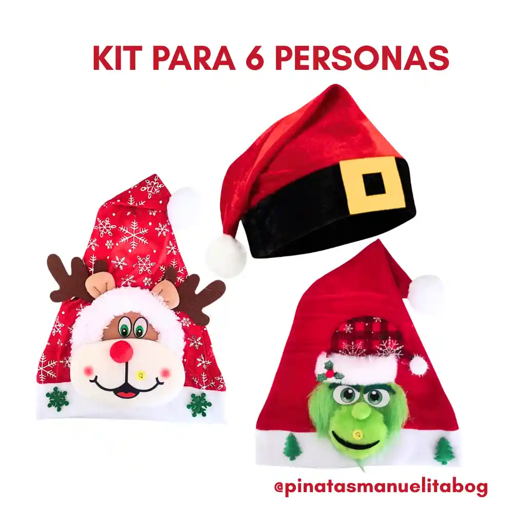 Set de accesorios para 4 personas para celebrar esta navidad, este kit incluye: ·2 Gorritos navideños grinch ·2 Gorritos navideños reno ·2 Gorritos navideños detalle cinturón Ideal para que toda la familia o amigos tengan los accesorios para celebrar esta navidad
