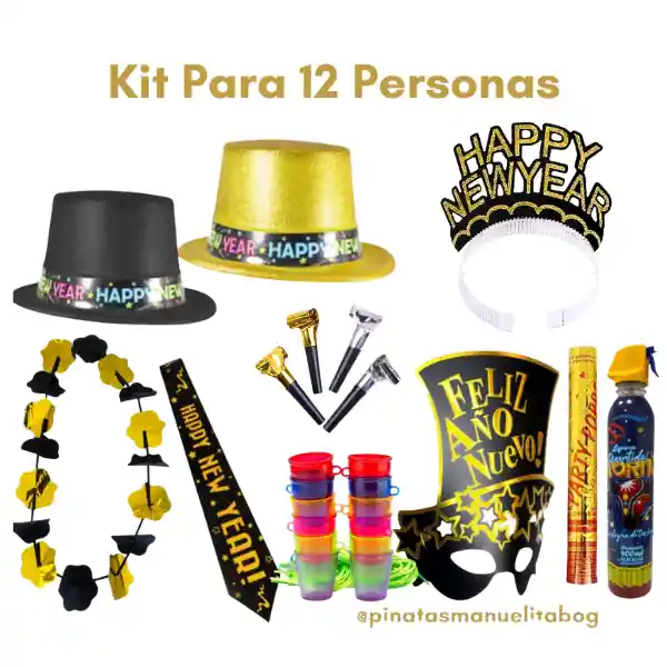 Set de accesorios para 12 personas para celebrar esta año nuevo, este kit incluye: ·4 Diademas Happy New Year en cartón ·4 Antifaces Feliz Año Nuevo ·4 Sombreros Happy New Year ·6 Collares negro con dorado ·6 Corbatas Happy New Year ·1 Paquete de pitos x 12 und ·1 Espuma ·1 Lanza confeti ·1 Paquete de shots x 12 und